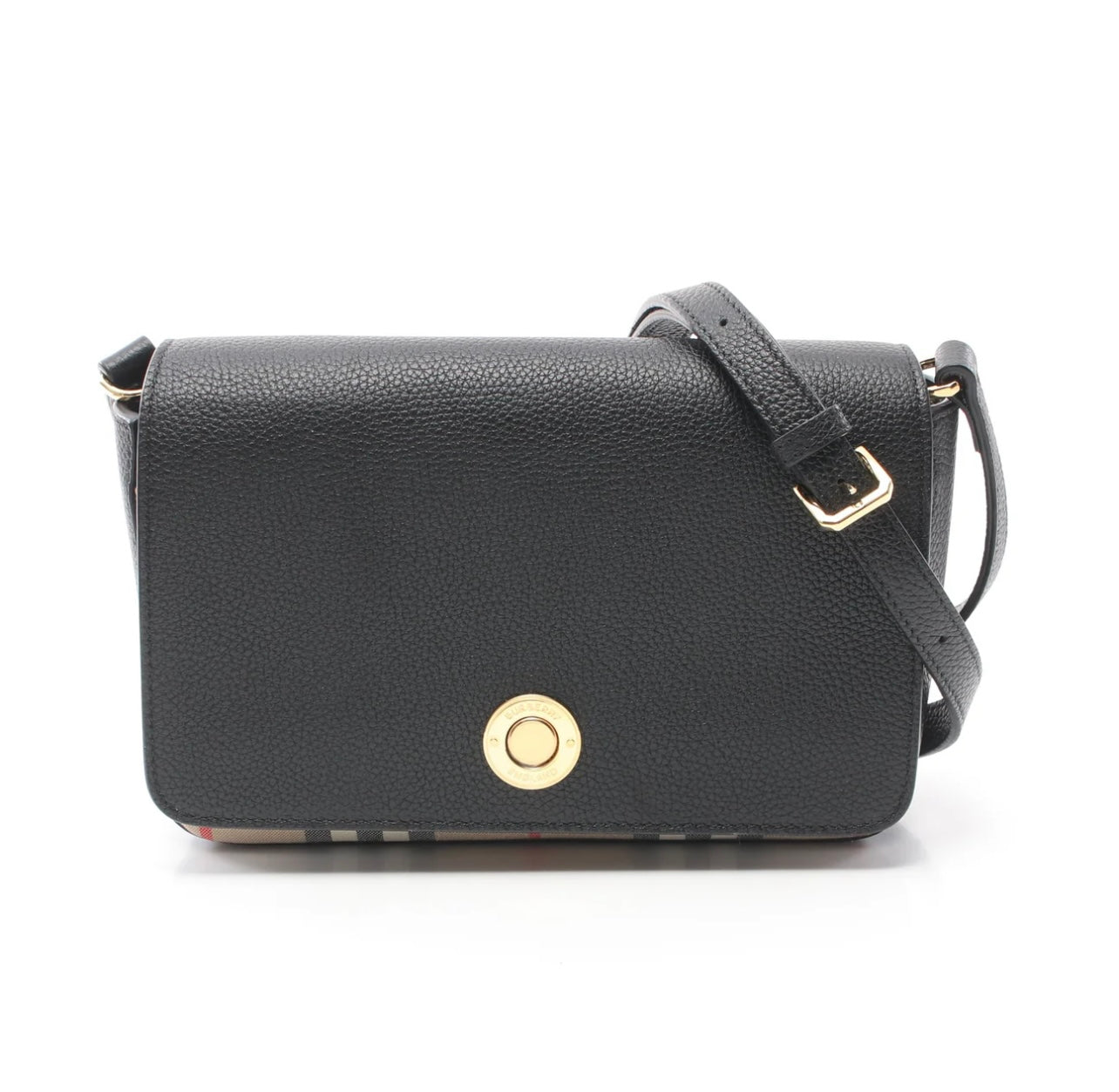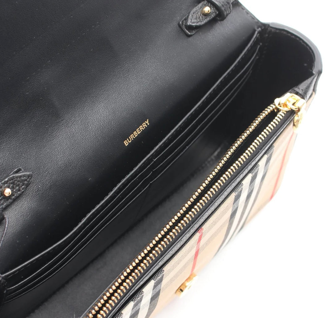 This is an authentic preloved BURBERRY Grainy Calfskin Vintage Check Hampshire Crossbody in Black excellent condition. This stylish wallet on strap is crafted of black calfskin leather and Burberry check canvas. This bag features a cross-body leather shoulder strap with gold hardware. This opens to a matching leather interior with card panels, flat pocket and zipper compartment.